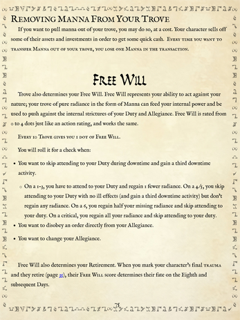 Seventh Day is Forged in the Dark, using the same core ruleset as Blades in the Dark, Scum & Villainy, Band of Blades, Sig - City of Blades, and Tribes in the Dark. It uses several of the rule innovations introduced in Blades in the Dark: Deep Cuts.
