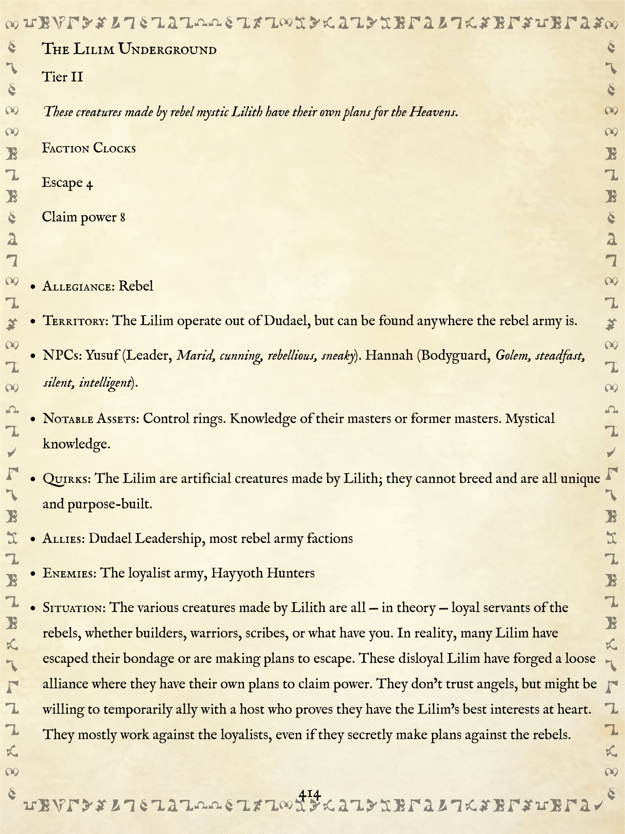 - Information on twenty-five detailed angelic factions, complete with NPCs and adventure hooks.